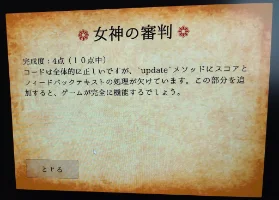 - 「女神の審判」(入力したプログラムの完成判定や、間違いの指摘などをしてくれる機能)